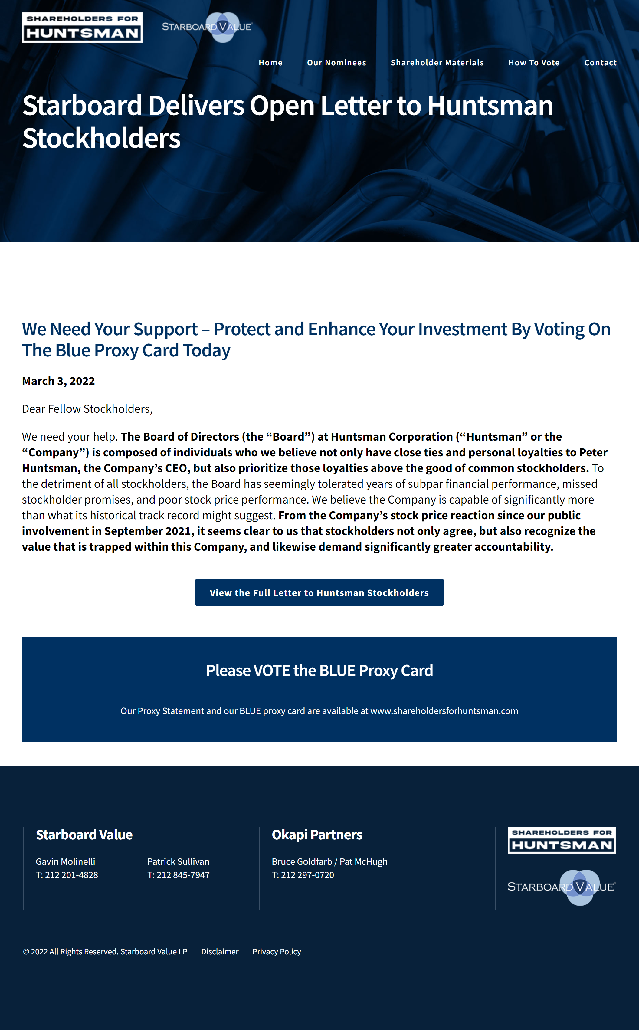 NEW YORK, NY March 4, 2022 /PRNewswire/ -- Starboard Value LP (together with its affiliates, “Starboard” or “we”), one of the largest stockholders of Huntsman Corporation (NYSE: HUN) (“Huntsman” or the “Company”), with an ownership interest of approximately 8.8% of the Company’s outstanding shares, today announced that it has delivered an open letter to Huntsman stockholders detailing why the election of Starboard’s slate of four highly-qualified and experienced nominees at the Company’s upcoming 2022 Annual Meeting of Stockholders is critical to drive accountability and demand operational excellence at Huntsman.