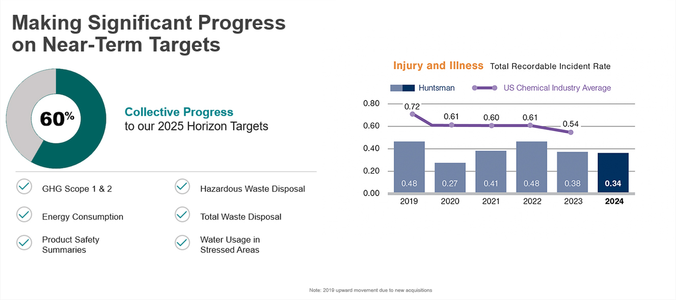 In pursuit of our goal – no accidents, no injuries, no harm to the environment – Huntsman’s global targets focus on personal and process safety, as well as improving environmental performance. Our sustainability program enables us to follow trends and report metrics in areas that are material to our stakeholders. Our intention always is to present our data so our progress can easily be tracked. See our sustainability reports for a detailed accounting of our performance against both GRI and SASB indicators.